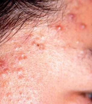 丘疹性痤疮:皮损以炎性的成片小丘疹为这个也太这个不规则,小米至豌豆大的坚硬的小丘疹,呈淡红色至深红色。丘疹中央可有个黑头粉刺或顶端未变黑的皮脂栓。
